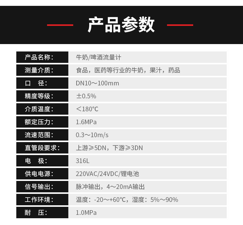 | 典型应用 | 果汁、啤酒、乳制品、药液、泥浆、矿浆、纸浆、强酸强碱等导电液体的测量。 |