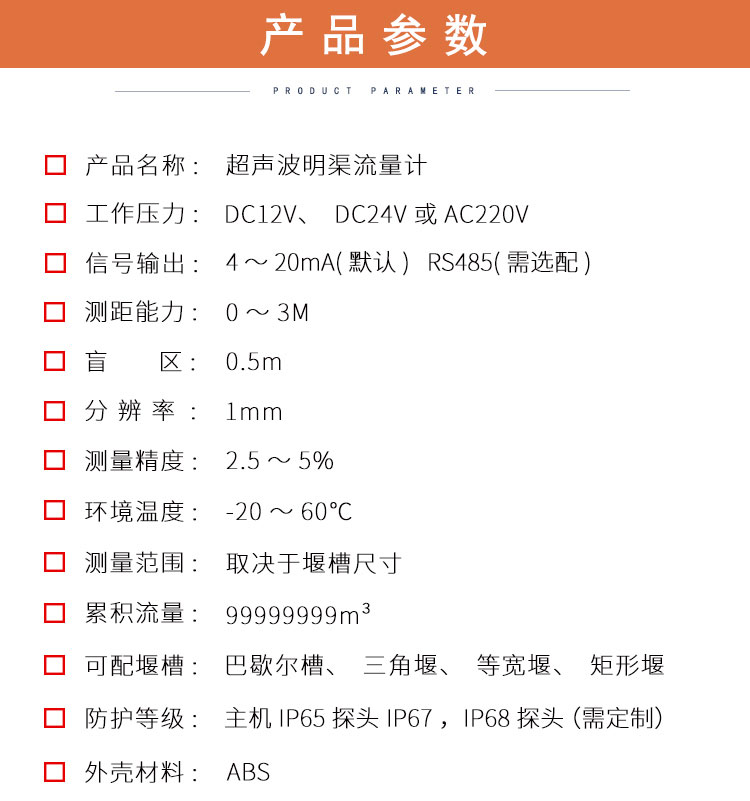 | 超声波明渠流量计 | 非接触式(液位+堰槽) | 耐腐蚀、安装方便、维护量小 | 依赖标准堰槽,前期土建要求高 | 污水、腐蚀性液体、大渠道 |
