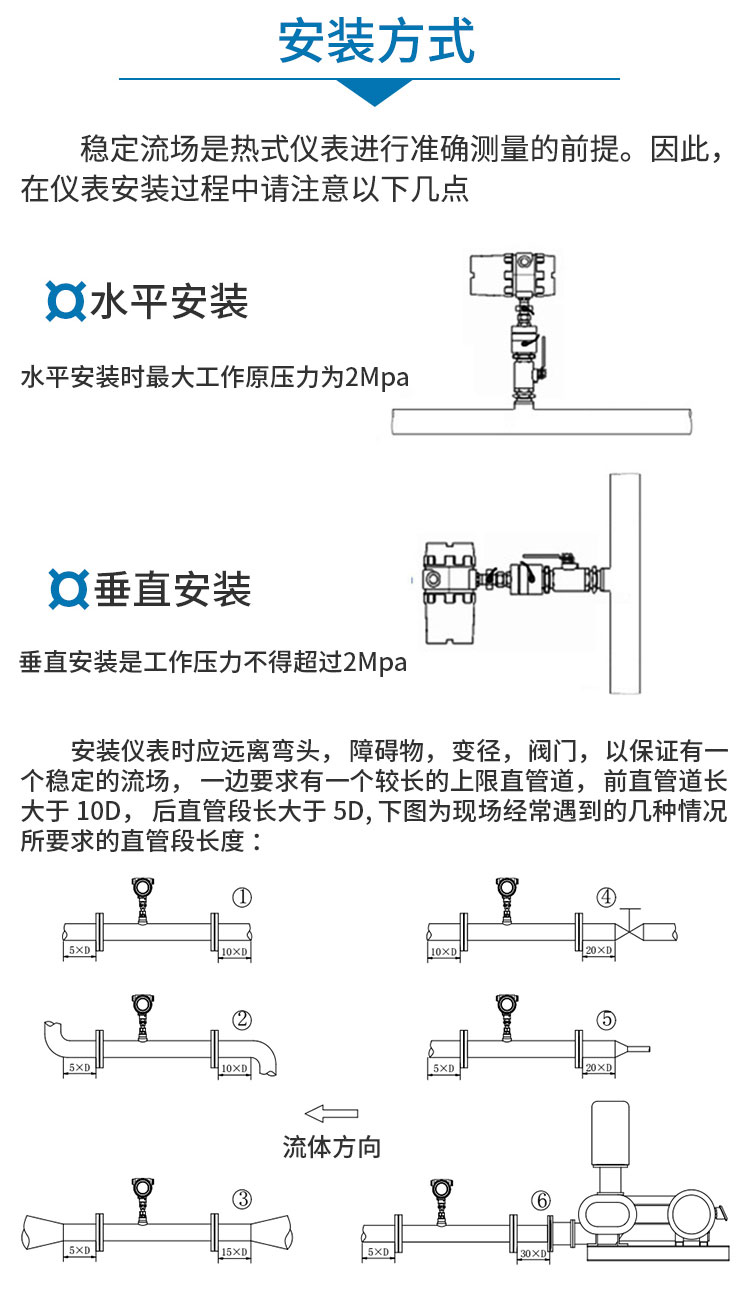 直管段要求:上游至少需要 10-15 倍管径的直管段,下游需要 5 倍管径的直管段,以确保流体充分发展,流速分布对称。若流场不稳定,可能需要安装整流器。
