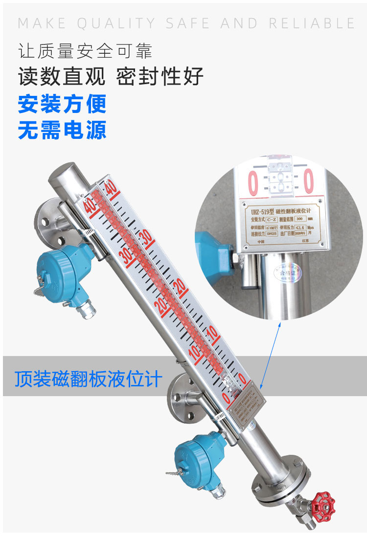 1. 磁翻板液位计(就地指示部分):这是基础。它通过一个连通器原理,使主体管内的磁性浮子随液位升降。浮子的磁性会吸引外部翻板上的磁柱翻转。翻板一面是醒目的颜色(如红色/橘色),另一面是另一种颜色(如白色)。液位之下,显示醒目的颜色;液位之上,显示另一种颜色。从而在设备现场可以非常直观地看到液位高度。