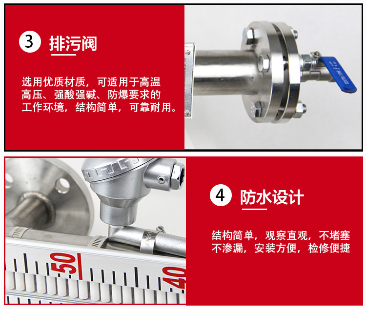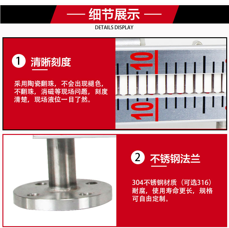 浮子的磁性会耦合到外部,吸引指示器上的磁性翻柱翻转。液位上升,翻柱由白转红;下降则由红转白,从而清晰指示液位。这种红白分界现象使得读数非常直观。