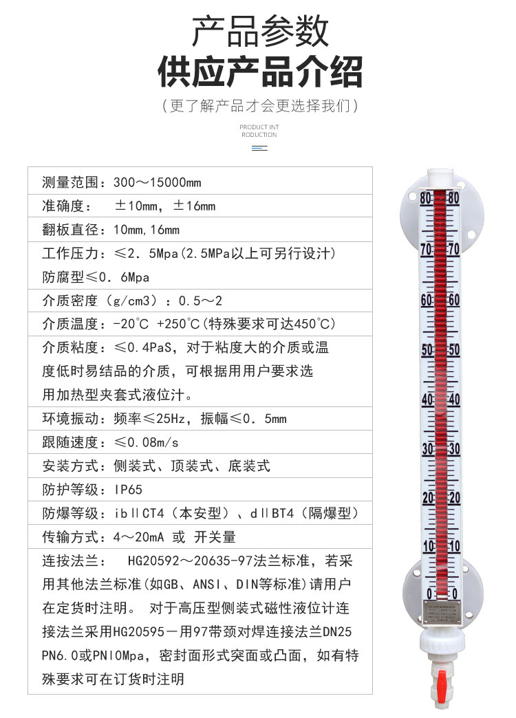 主要由本体、磁翻柱(由红、白双色磁性小翻柱组成)、浮子、法兰盖等组成,还可配备液位报警、控制开关、液位变送器等部件,实现报警和远传功能。