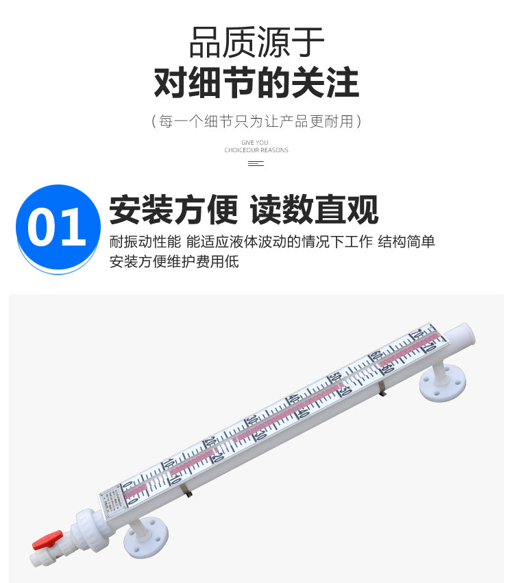 显示直观:红绿显示鲜艳,显示亮度高,可视距离远,标尺清晰,显示角度大,便于现场观察液位。