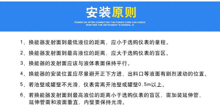 传感器发射面到最低液位的距离应小于量程,到最高液位的距离应大于盲区。