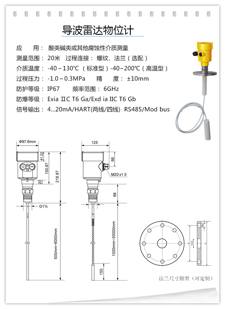 安装方式:根据现场安装条件选择,如法兰式适用于固定储罐,导波管式适用于移动介质或大范围监测。