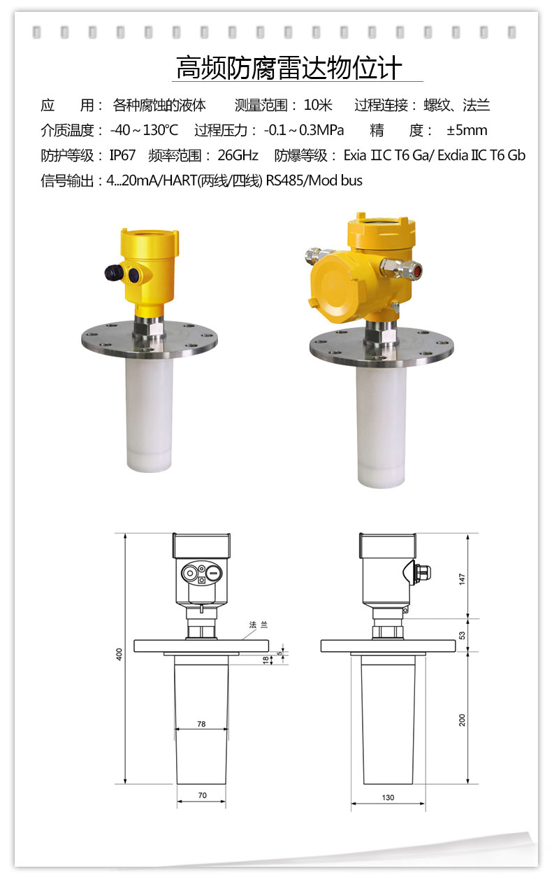 测量精度高:高频雷达波波长更短,如 26GHz 雷达波长约 11mm,78GHz 约 3.8mm,对细微液位变化的识别能力更强,常规测量误差可低至 ±1mm,部分高端型号甚至可达 ±0.5mm。
