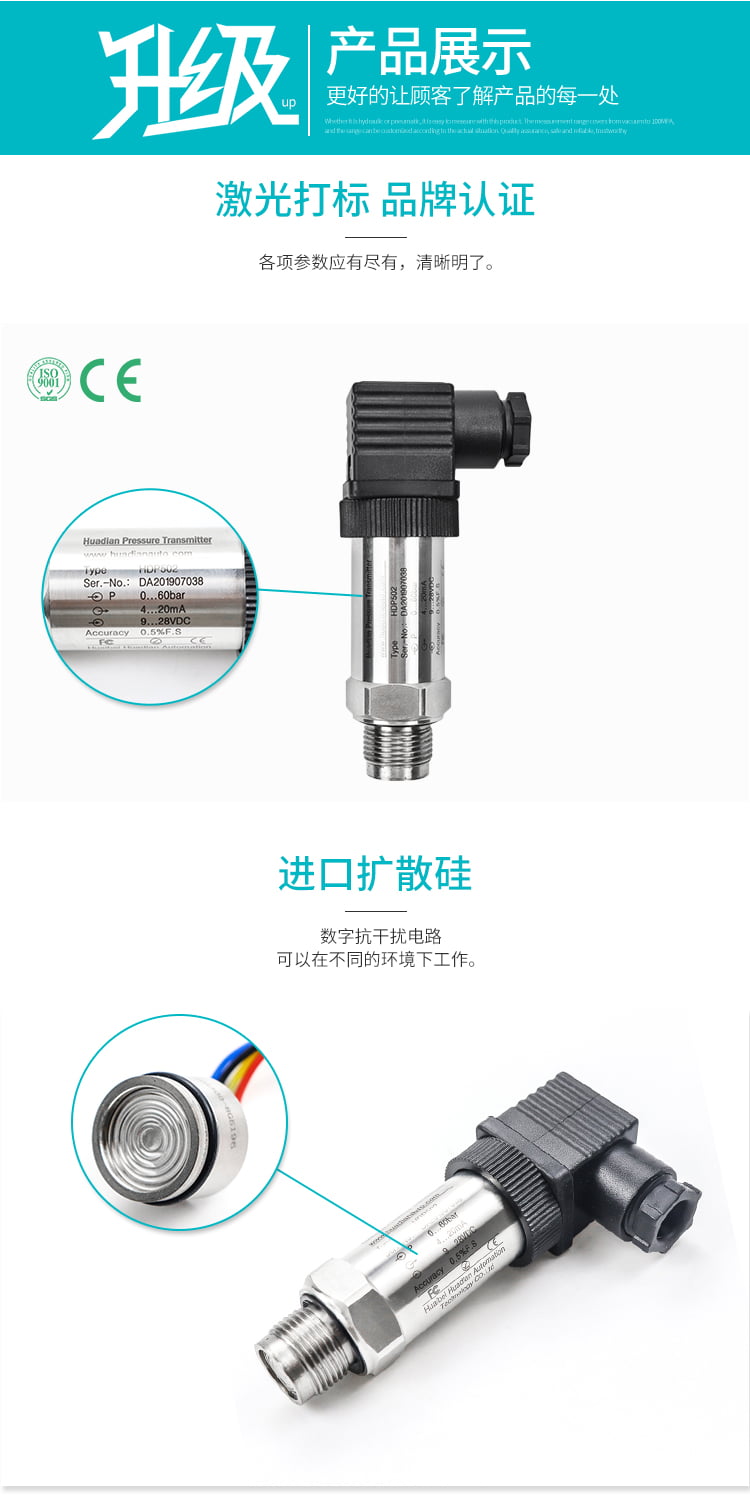 - 其他关键参数:响应频率差异较大,普通型号约3.2kHz,高端型号如莱博迈产品测量速率可达100Hz,可捕捉微小压力波动;过载压力一般为150%FS,破坏压力达300%FS,能抵御生产过程中的压力冲击;输出信号以两线制4 - 20mA为主,部分支持1 - 5V、0 - 10V等电压信号,适配不同控制系统。