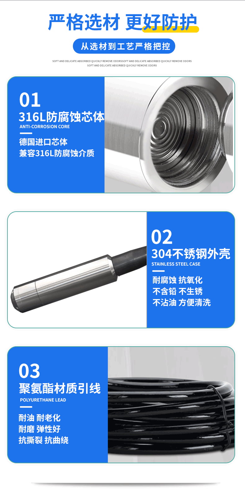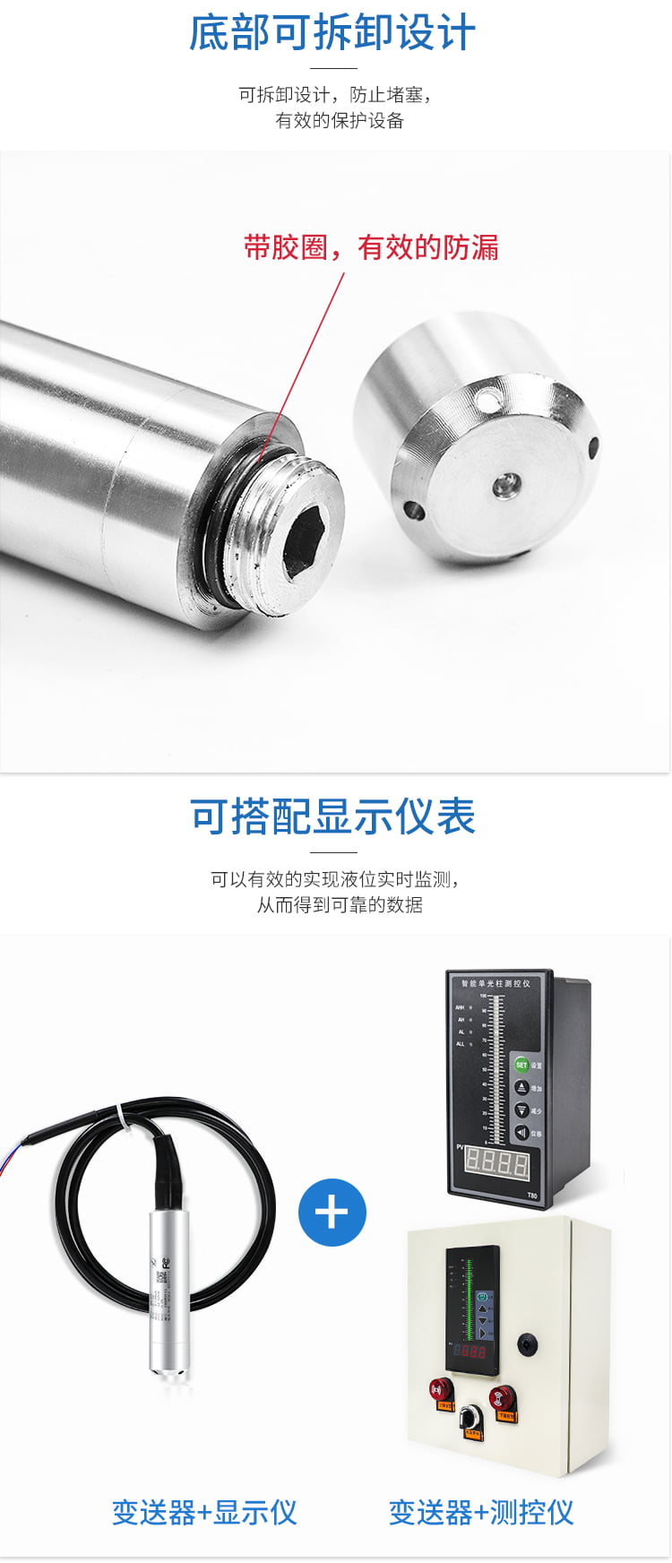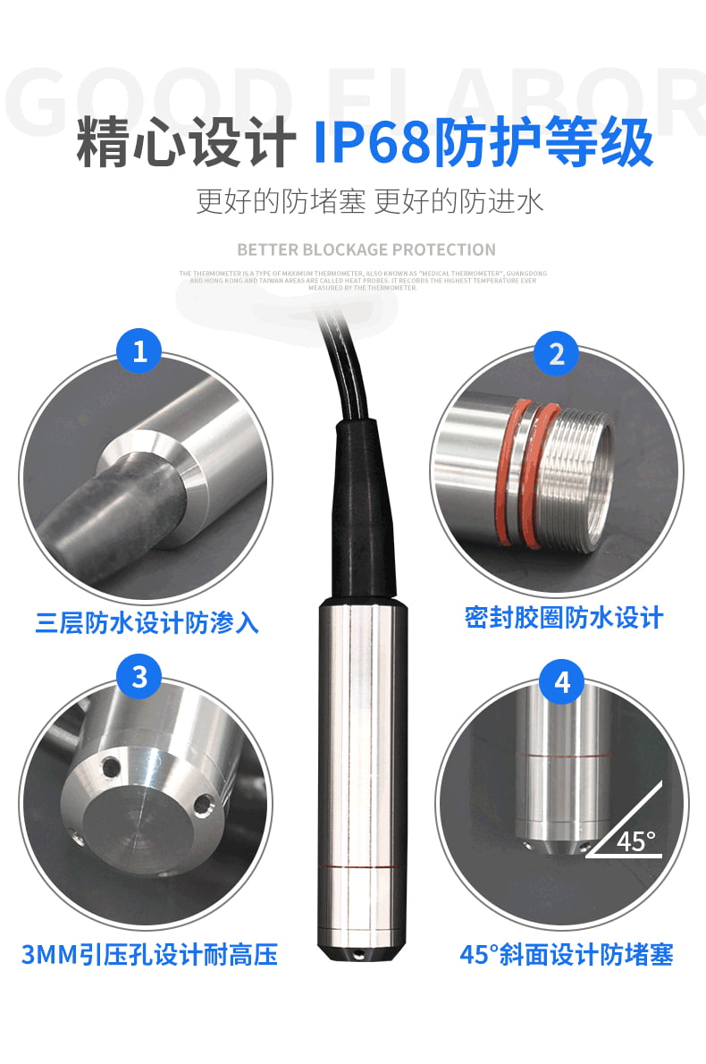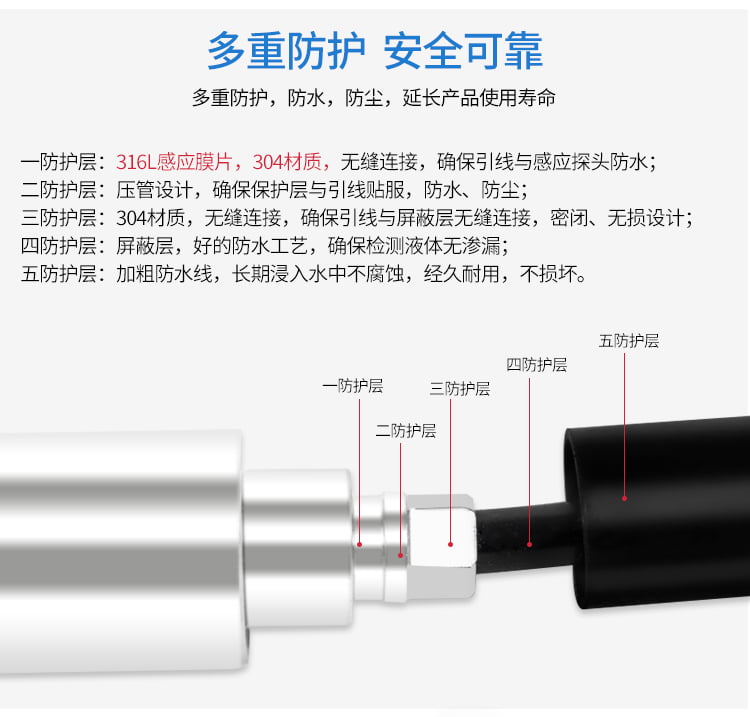 - 普通防护型:防水等级IP67,材质316L不锈钢,适用于洁净水、油类等无腐蚀介质;