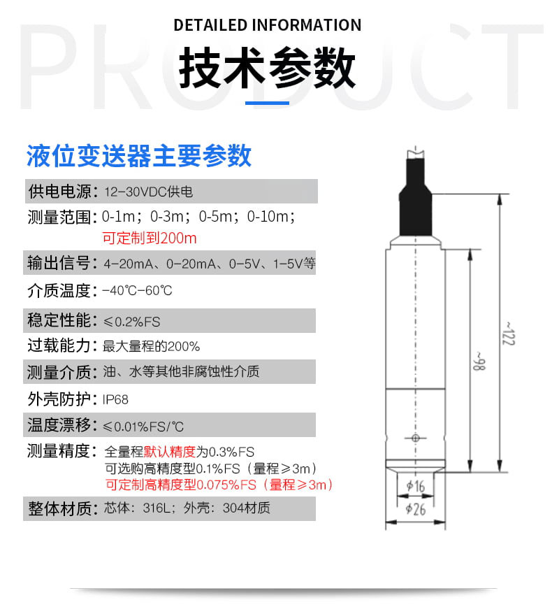 投入式液位变送器的技术参数直接决定其测量精度、适用范围和稳定性,以下为核心参数的详细说明: