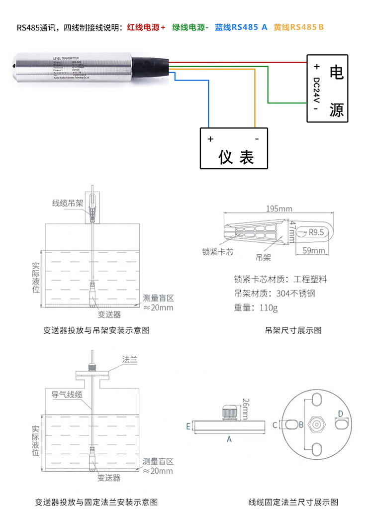 | 安装固定装置 | 探头固定与定位 | 不锈钢支架、法兰、螺纹接头(M20×1.5、G1/2等) | 安装牢固,可调节探头深度,耐腐蚀 |