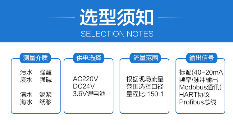 - 流量范围:流速0.5-6m/s,管径范围DN20-DN300。