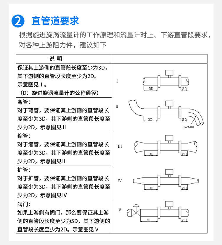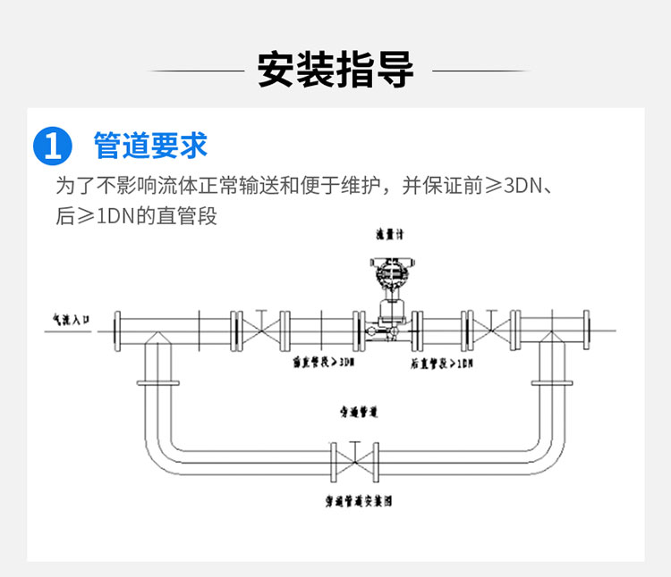 4. 直管段要求:为保证流体流态的稳定,仪表上游和下游需要足够长的直管段(通常上游为5D~10D,下游为3D~5D,D为管道直径,具体以厂家说明书为准)。