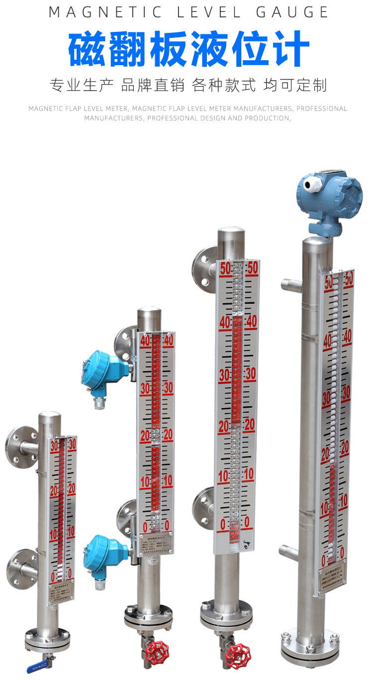 1. 磁翻板液位计(就地指示部分):这是基础。它通过一个连通器原理,使主体管内的磁性浮子随液位升降。浮子的磁性会吸引外部翻板上的磁柱翻转。翻板一面是醒目的颜色(如红色/橘色),另一面是另一种颜色(如白色)。液位之下,显示醒目的颜色;液位之上,显示另一种颜色。从而在设备现场可以非常直观地看到液位高度。