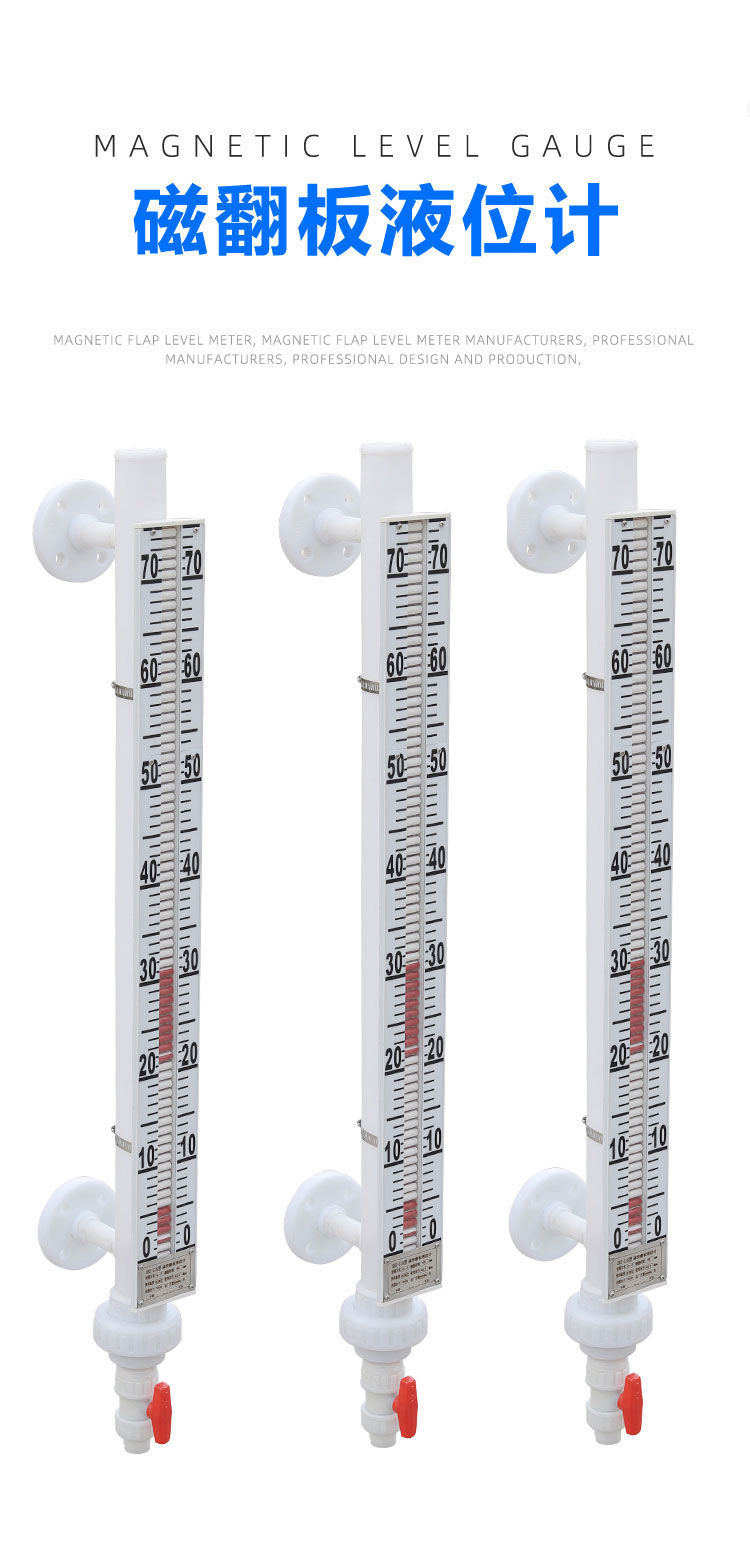 5. 颜色指示:翻柱通常被涂成红色和白色两个半圆柱。当翻柱翻转后,朝向观察者的一面会改变颜色。通常,液位以上的翻柱显示白色,液位以下的翻柱显示红色。这样,红白分界处就是非常醒目、精确的液位高度。