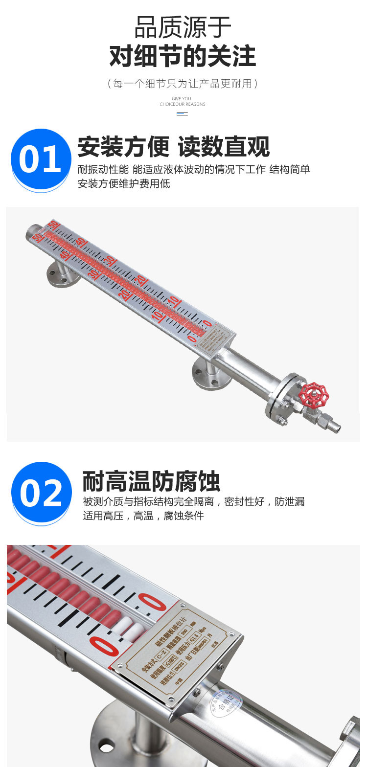 | 基本工作原理 | 基于浮力原理和磁耦合作用。浮子随液位升降,驱动外部翻柱翻转显示(液位部分通常为红色)。 |