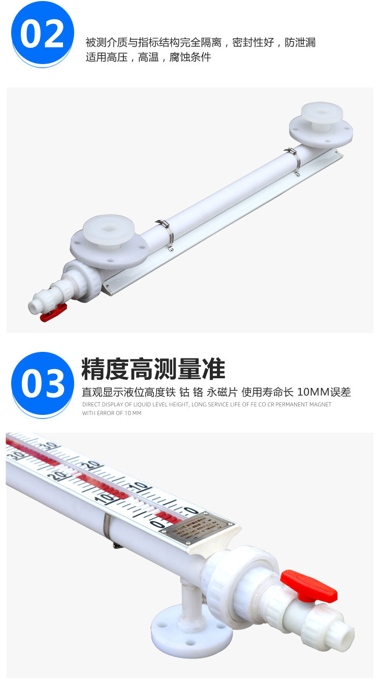 主要由本体、磁翻柱(由红、白双色磁性小翻柱组成)、浮子、法兰盖等组成,还可配备液位报警、控制开关、液位变送器等部件,实现报警和远传功能。