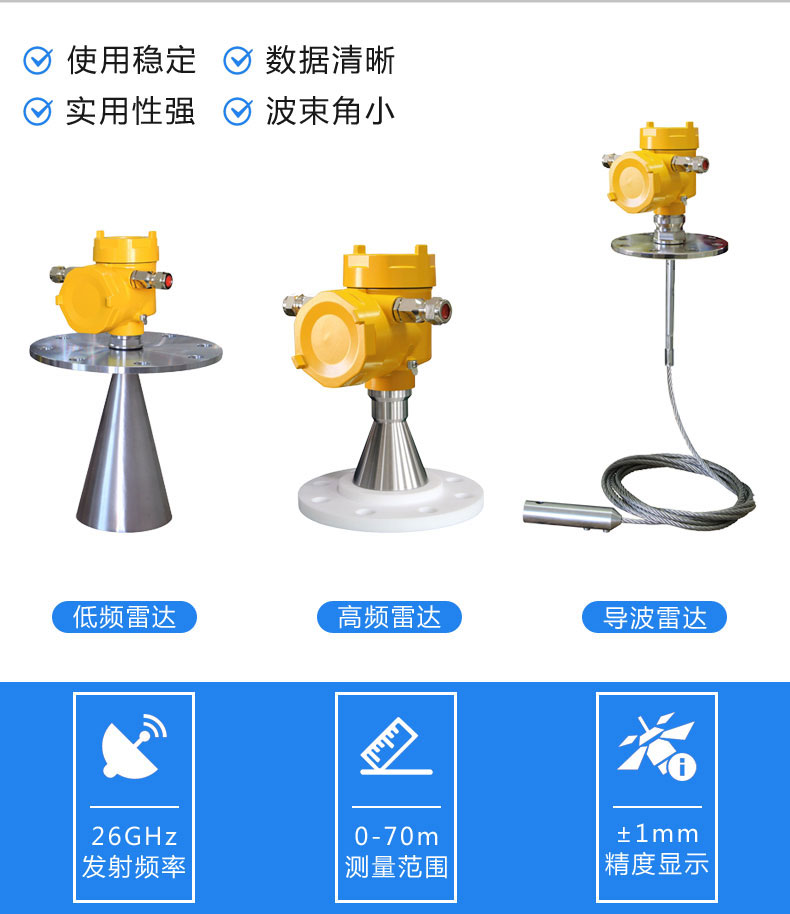 导波雷达:采用缆绳或杆式探头,微波脉冲沿着探头传播,接触到被测介质后反射回来,被电子部件接收并分析计算其运行时间,从而确定物位,穿透力强,适用于粉料、粘稠介质。