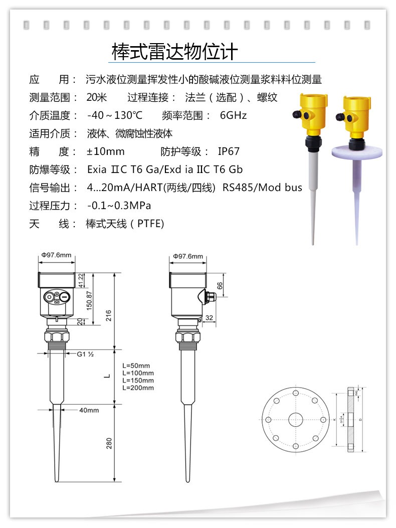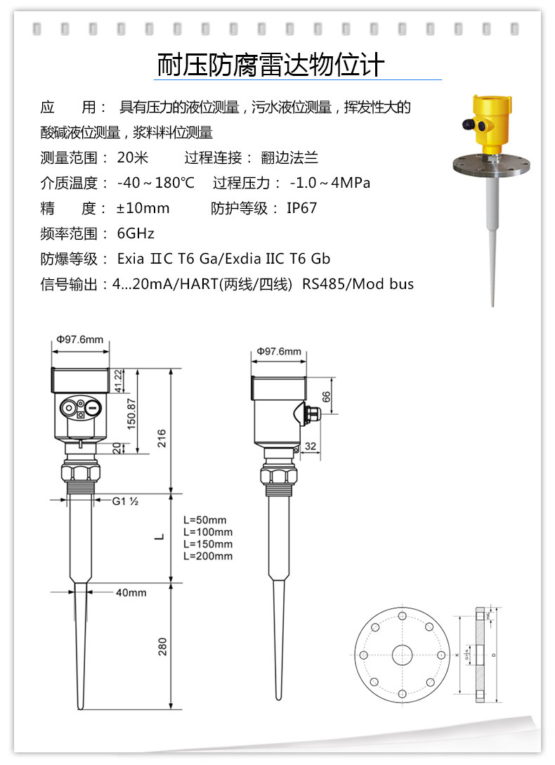 高频雷达液位计:工作频率 26GHz,最大量程 70 米,适用于测量固体和低介电常数介质。