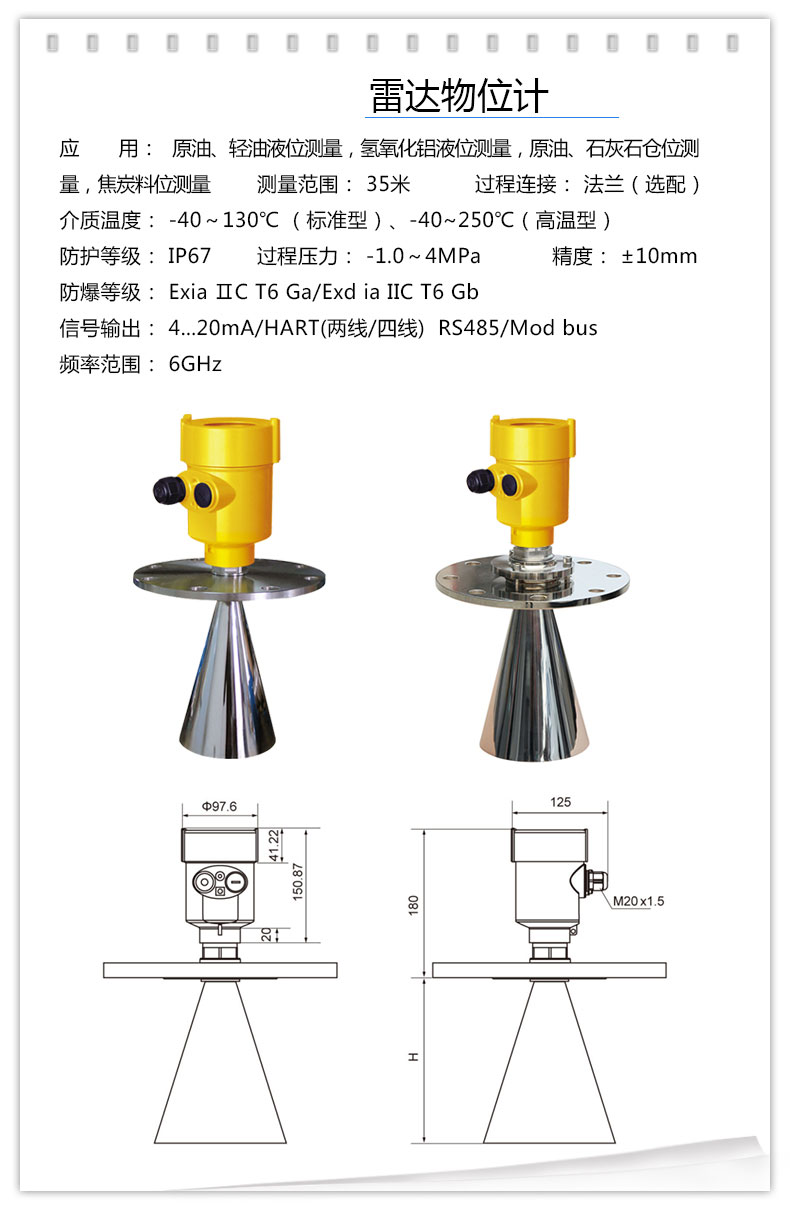 测量精度高:高频雷达波波长更短,如 26GHz 雷达波长约 11mm,78GHz 约 3.8mm,对细微液位变化的识别能力更强,常规测量误差可低至 ±1mm,部分高端型号甚至可达 ±0.5mm。