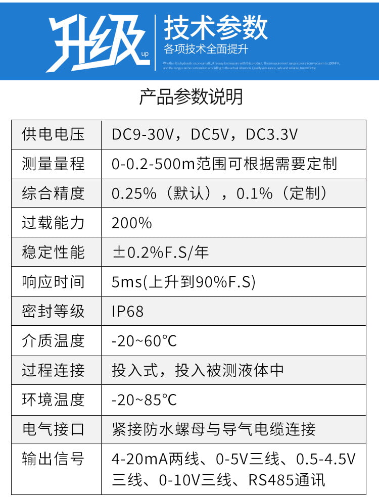 投入式液位变送器的技术参数直接决定其测量精度、适用范围和稳定性,以下为核心参数的详细说明: