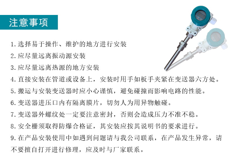 - 防爆型产品安装时,确保接线盒密封件完好,电缆引入装置压紧(防止易燃易爆气体进入),禁止在危险环境中拆卸变送器。