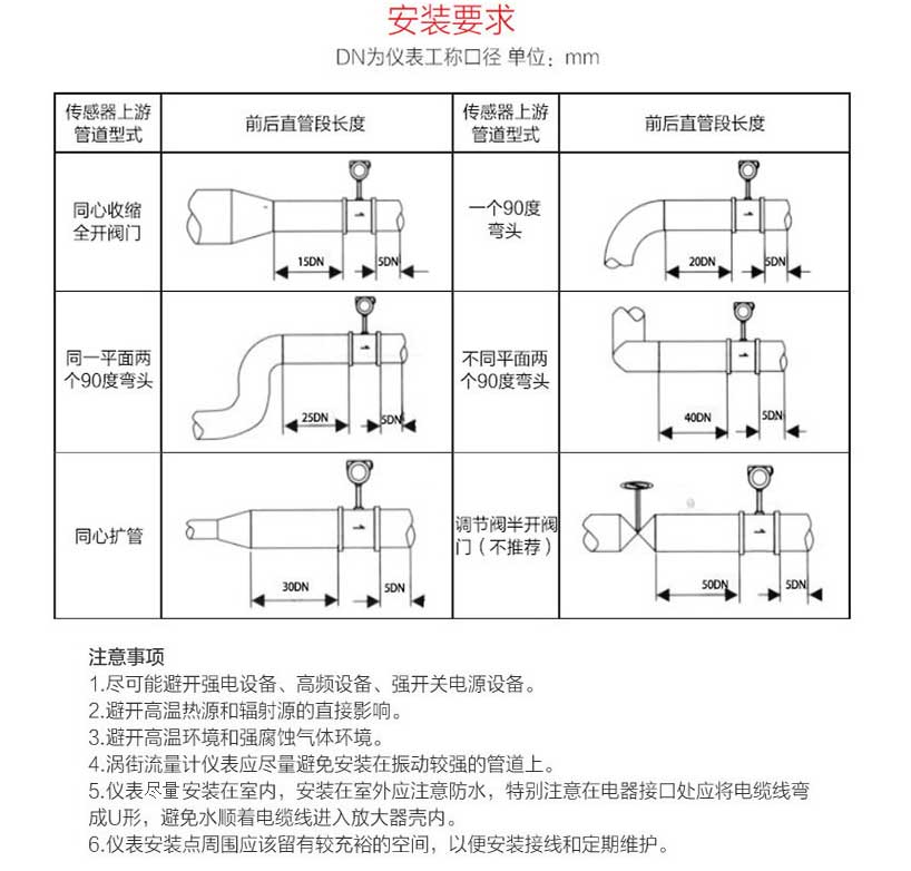 | 直管段 | 按仪表类型严格执行:涡轮/涡街(前10D后5D)、超声(前20D后10D)、差压式(前20D后10D) | 直管段不足会导致流场畸变,精度下降至±5%以上 |